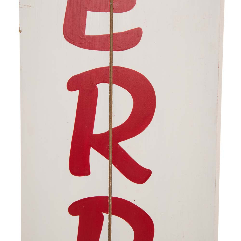 This cute vertical porch sign features the message Merry in red on a white wood background. This wooden sign is made of wood, finished in red and black, finish to give a festival atmosphere. This sign makes a unique home decor item. You can use it to decorate areas such as your loft, foyer, porch, or living area. The care and maintenance required for this item are minimal; just a gentle wipe with a damp cloth will suffice.